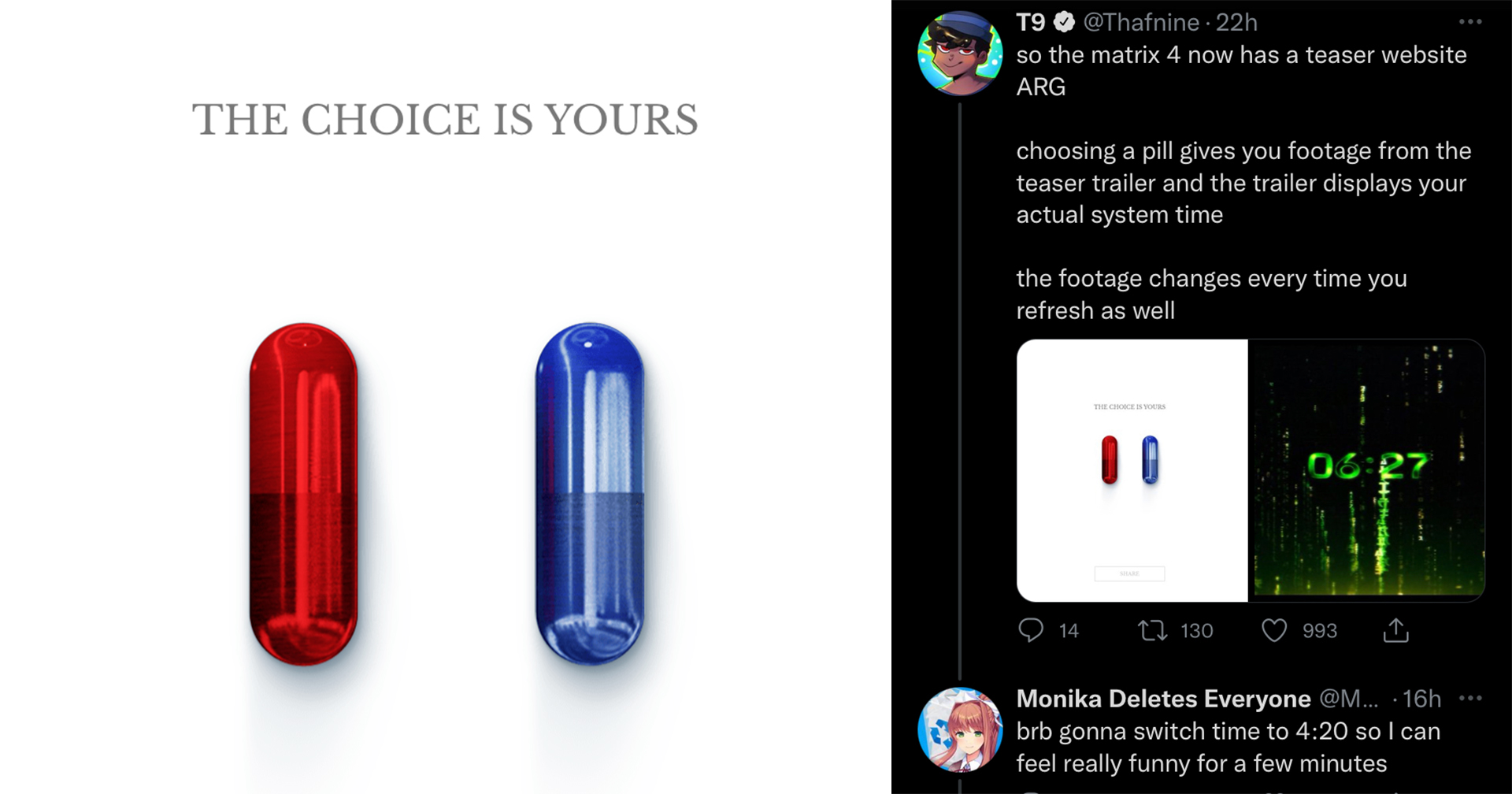A website dedicated to The Matrix has everyone talking. The Choice Is Yours reads above two pills. The Matrix Resurrections will drop its official trailer on Thursday however fans got a taste of the new flick today.