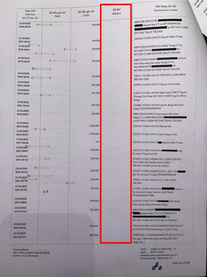 Tuổi 19 Công Vinh đã giành QBV Việt Nam trừ Văn Quyến thì chưa cầu thủ nào làm được. Đối với in sao kê đột xuất theo yêu cầu của khách hàng chi phí tại Vietcombank cũng là 5000 đồngtrang. Nếu bạn sao kê đầy đủ minh bạch thì uy tín bạn sẽ được nhân lên cộng đồng ngưỡng mộ bạn Công Vinh cũng ko nên nóng nảy vì bạn bảo TT đã đi từ thiện nhiều lần rồi việc sao kê tại Ngân hàng ko khó mà đã 8 tháng rồi vấn đề bạn chứng minh đã chi khớp đúng số tiền đã nhận một cách minh bạch.