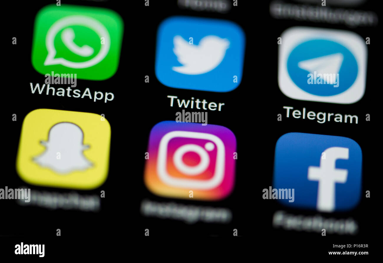 Illustration 6 Juin 2018 Rottweil Allemagne Les Logos De La Apps Whatsapp L R Twitter Et Telegramme Ainsi Que Napchat De Gauche A Droite Rangee Du Bas Instagram Et Facebook Peut